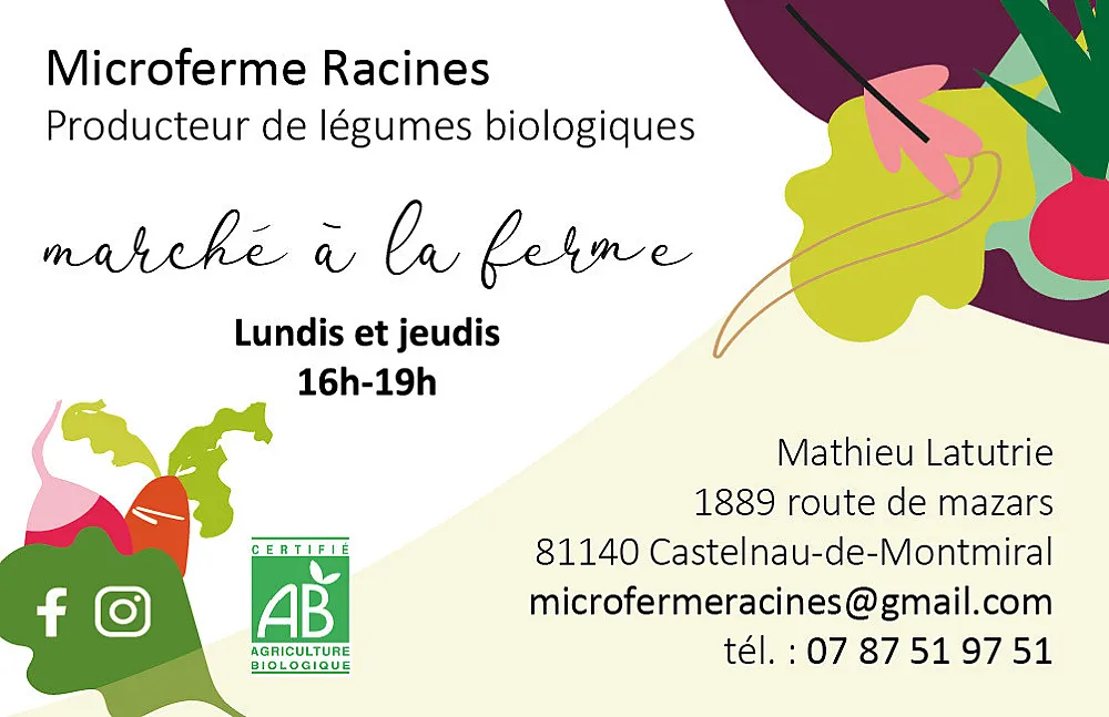 La Microferme Racines est située dans le Tarn sur la commune de Castelnau de Montmiral dans un environnement naturel privilégié aux portes de la forêt de la Gresigne, au cœur du vignoble Gaillacois et entouré de bastides et de villages classés. L’activité principale de la ferme est la production de légumes bio de saison.